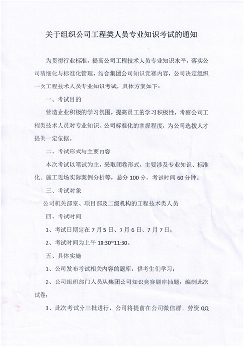 關(guān)于組織公司工程類人員專業(yè)知識考試的通知