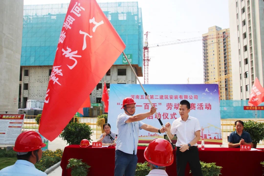 儀式開始后,吳部長首先宣讀了《河南五建二公司在建項目“大干一百天”勞動競賽實施方案》。此次競賽活動共有11個主體在建的項目部參加,公司對此次活動高度重視,成立了以吳萬仁董事長為主任的勞動競賽組委會,全面負責競賽工作的部署、督促、檢查及評比。此外,公司還對本次競賽活動的目標、范圍、內容以及競賽評價、總結表彰等工作進行了詳細的策劃和安排。佳和熙岸項目部負責人蔡旺軍代表競賽項目部做了發(fā)言,呼吁所有競賽項目要為此次競賽活動取得圓滿成功而不懈努力。公司副總經(jīng)理吳建功對競賽活動提出具體的工作要求,他在講話中提到此次競賽活動的重要意義,要求所有參與者都要提高思想站位,高度重視,各競賽項目、機關各部門以及勞動競賽組委會要各專所長、密切配合,充分發(fā)揮創(chuàng)新引領作用,積極完成此次“大干一百天”勞動競賽活動。
