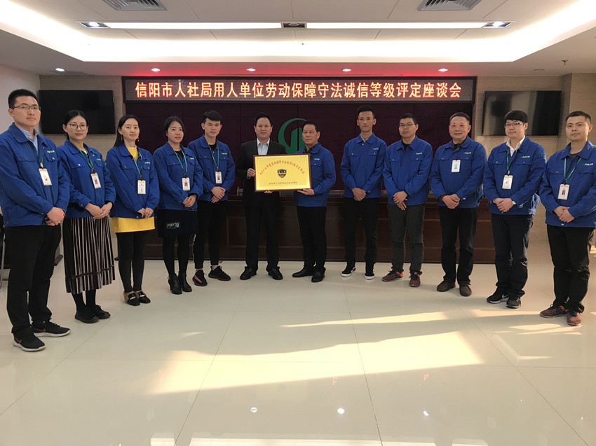 3月26日,信陽市人社局鄭科長一行三人來到我公司,開展用人單位勞動保障守法誠信等級評定座談會,并舉行授牌儀式。公司黨委書記、工會主席朱明友代表公司接受這一榮譽(yù)。