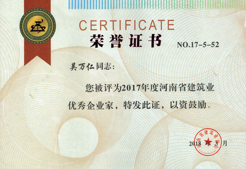 近日,河南省建筑業(yè)協(xié)會(huì)發(fā)布公告,公司榮獲2017年度“河南省建筑業(yè)前二十強(qiáng)企業(yè)”、“河南省建筑業(yè)先進(jìn)企業(yè)”、“河南省建設(shè)工程質(zhì)量管理先進(jìn)企業(yè)” 、“河南省建筑安全先進(jìn)企業(yè)” 、“河南省建筑業(yè)技術(shù)創(chuàng)新先進(jìn)企業(yè)”多項(xiàng)榮譽(yù),公司董事長(zhǎng)、總經(jīng)理吳萬(wàn)仁被評(píng)為“河南省建筑業(yè)優(yōu)秀企業(yè)家”,公司副總工、工程部部長(zhǎng)吳善艷被評(píng)為“河南省建筑業(yè)企業(yè)優(yōu)秀總工程師”。