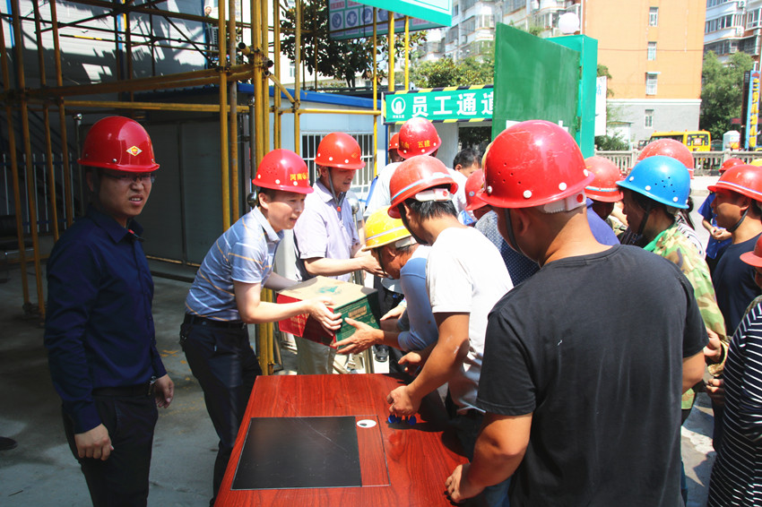 近期,連日高溫,驕陽似火,為保證施工進度,奮戰(zhàn)在一線的項目職工戰(zhàn)高溫、斗酷暑,在滾滾熱浪中保質(zhì)保量、高效地完成著施工生產(chǎn)任務。為做好防暑降溫工作,保障一線員工的健康權益,信陽市住房和城鄉(xiāng)建設局副局長陳弋明攜市城建監(jiān)察支隊隊長蔡維全及城建監(jiān)察人員一行不畏酷暑,來到我公司湖東春天項目部,為奮戰(zhàn)在一線的廣大員工送去了絲絲涼意,還有端午佳節(jié)的親切問候。
