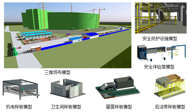 2、三維場布模型施工現(xiàn)場平面布置三維場布建模采用Revit軟件創(chuàng)建,分為:現(xiàn)場布置三維場布模型、后澆帶樣板模型、衛(wèi)生間樣板模型、屋面樣板模型、機電樣板模型、安全體驗館樣板模型、安全防護設(shè)施模型(圖3)。